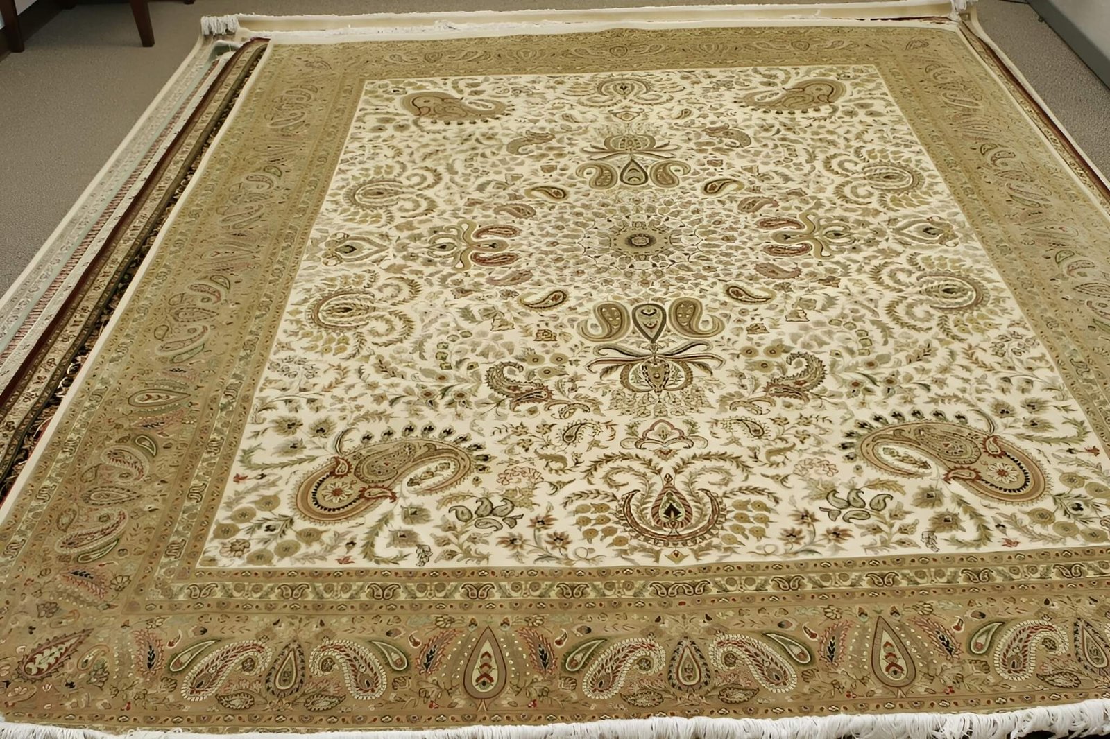 The gold portion of the rug has a slight texture to it, while the ivory accents are smooth with gold accents throughout. The pattern is traditional, with intricate floral or geometric shapes woven into the rug.
