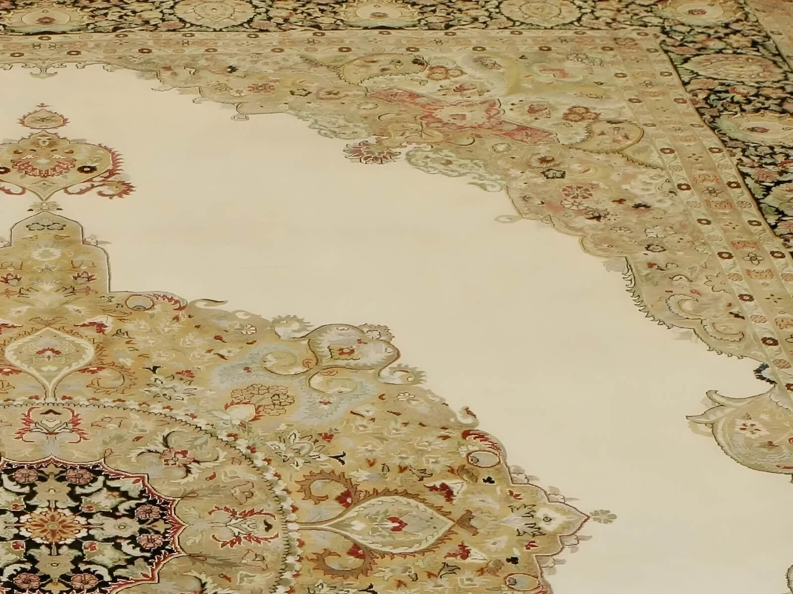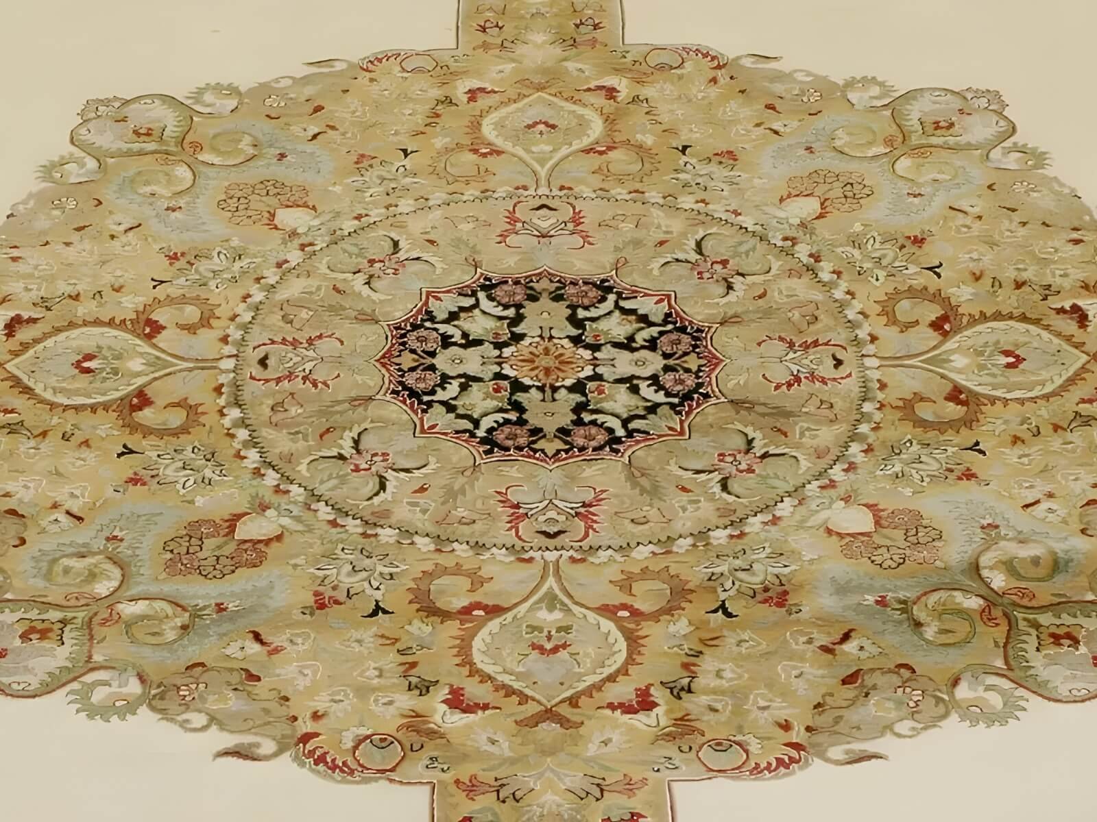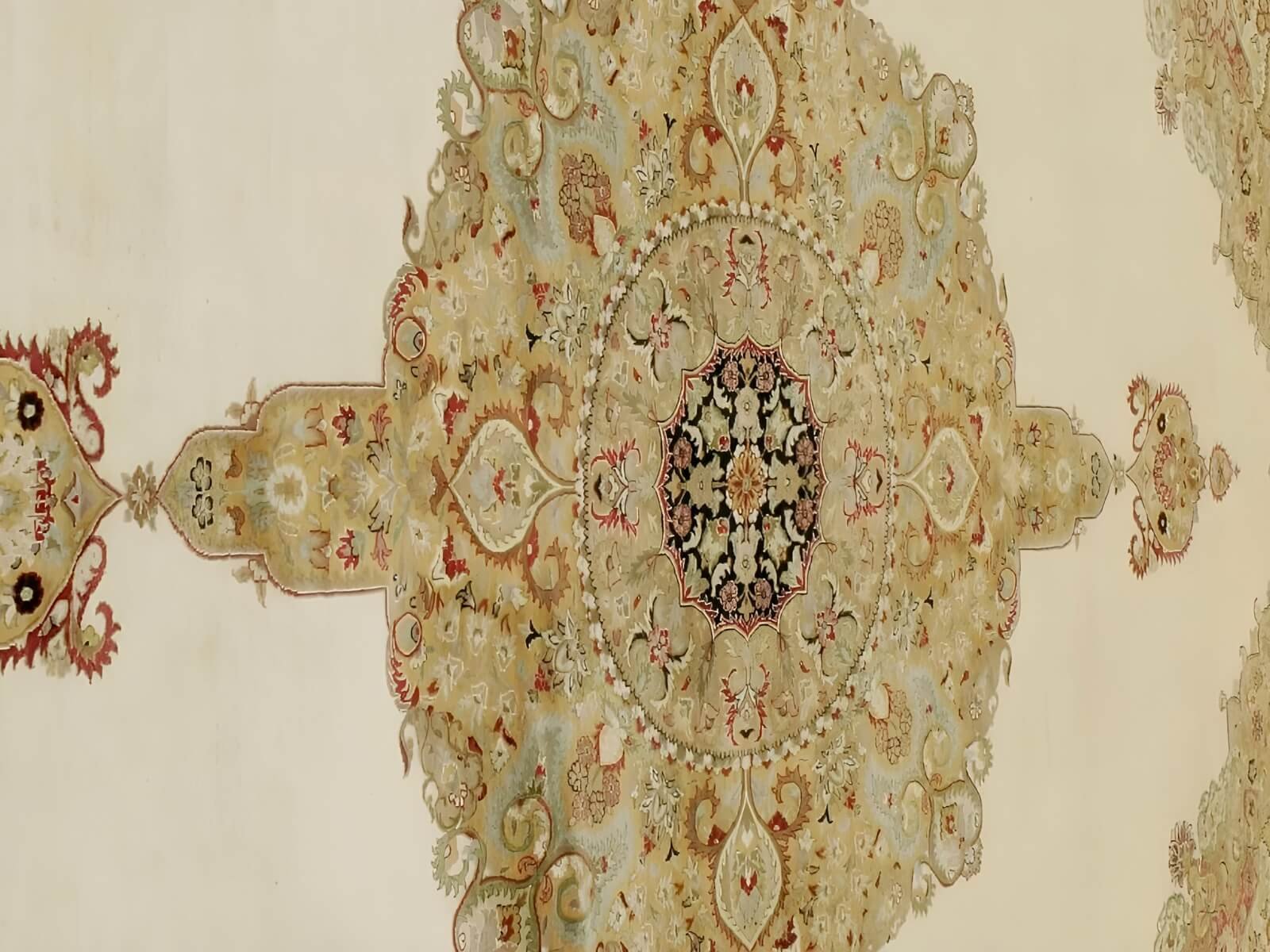 The gold, intricate medallion is placed in the center of the rug, with the other design elements emanating outwards. The outer design create a border of beautiful, geometric and floral patterns.