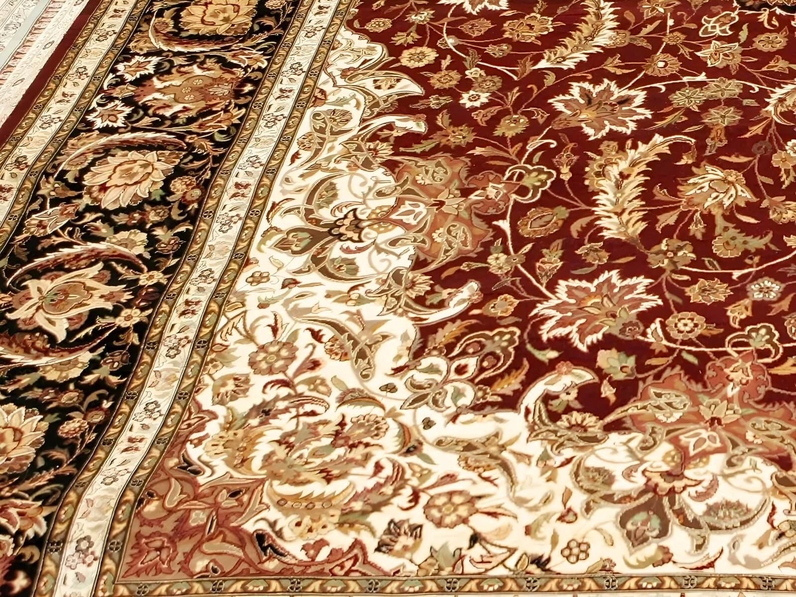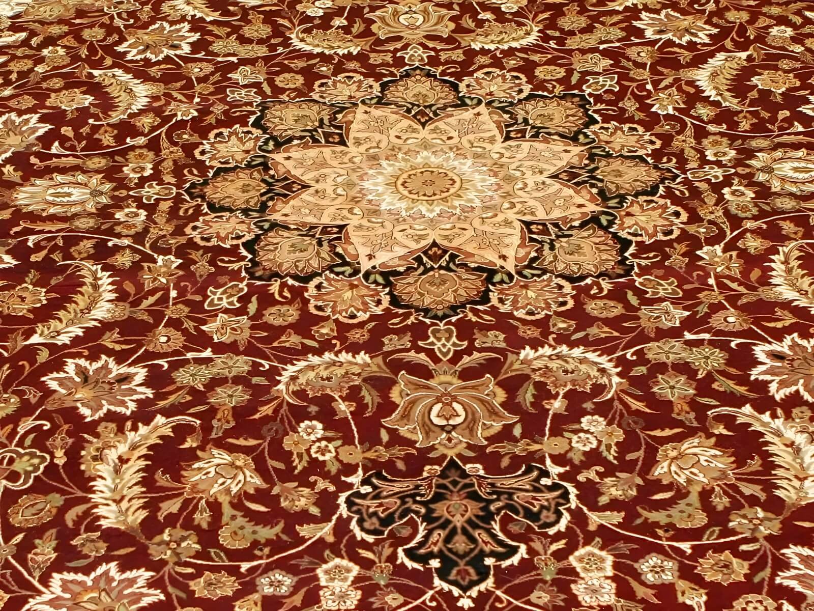 This rug features an indescribably beautiful, central medallion design in shades of maroon and black. The Maroon and Black Tabriz Medallion rug is a classic example of the traditional Tabriz style and is sought after by rug collectors and enthusiasts worldwide.
